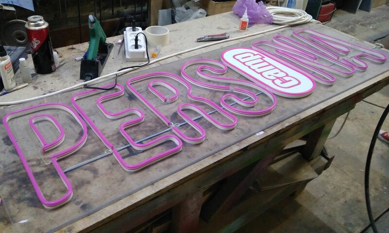 Для создания объема буквы соединили между собой с помощью металлических профилей. Внутри конструкции установлены светодиодные модули, которые обеспечивают равномерное освещение. Светодиоды монтируются на подложку, которая крепится к задней части букв, а затем закрывается защитным стеклом для предотвращения повреждений.